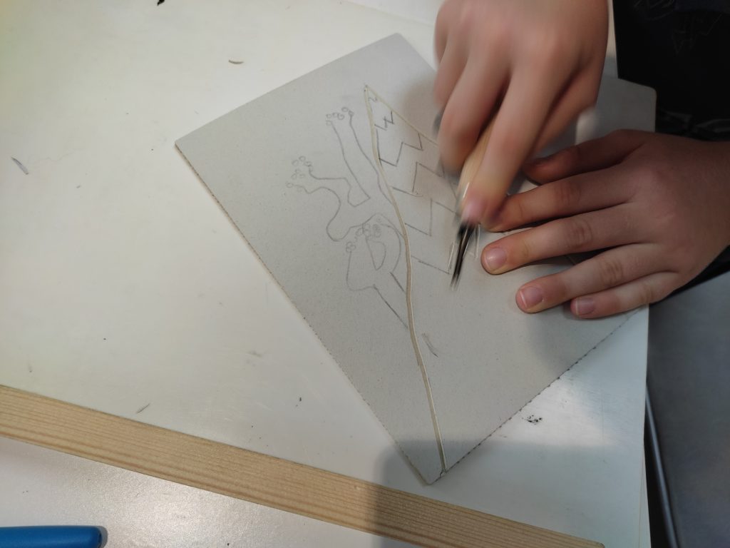 A partir d’un dessin de leur choix ou d’images tirées de livres qu’ils ont reporté sur une plaque de linoleum, les participants ont commencé la gravure, à l’aide de gouges.