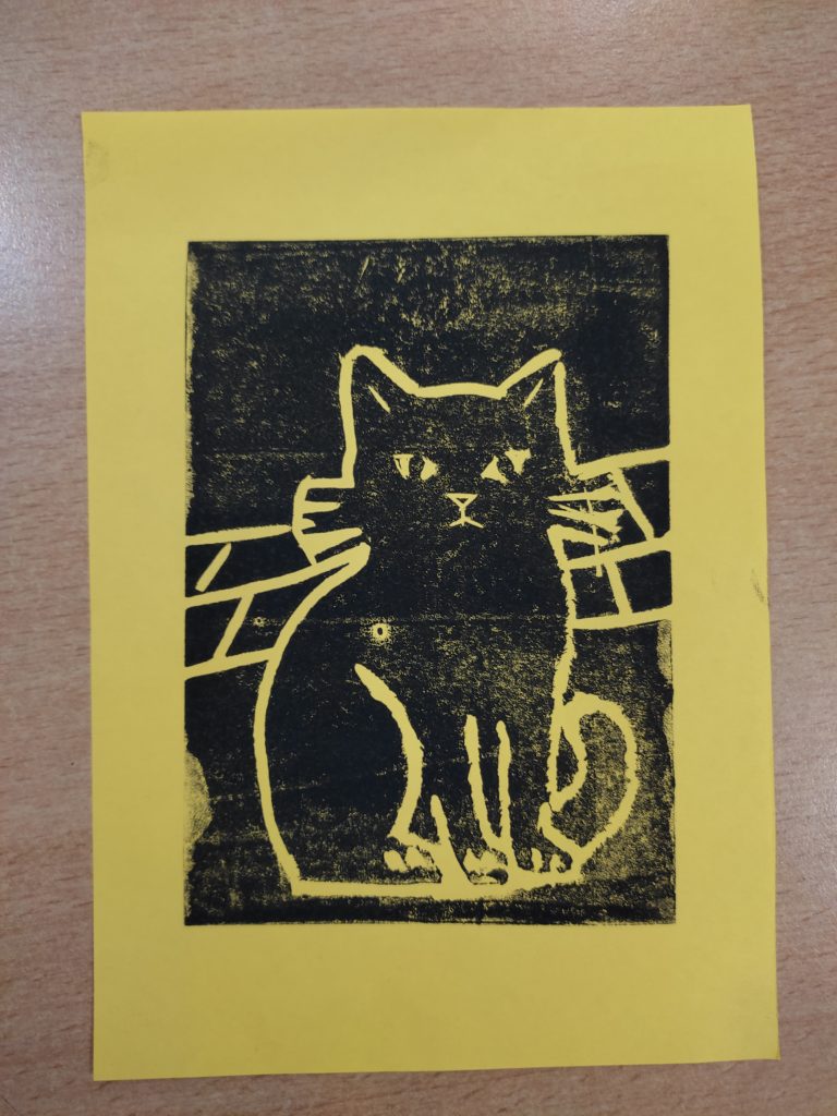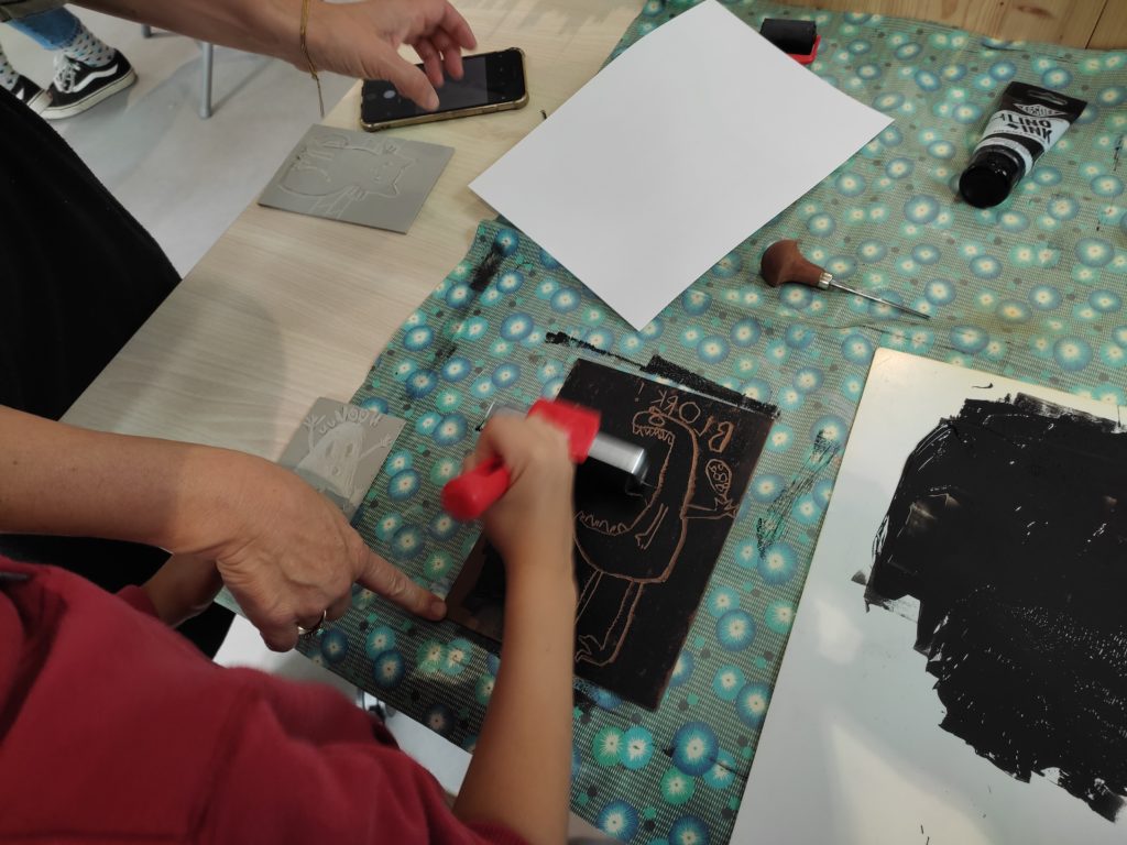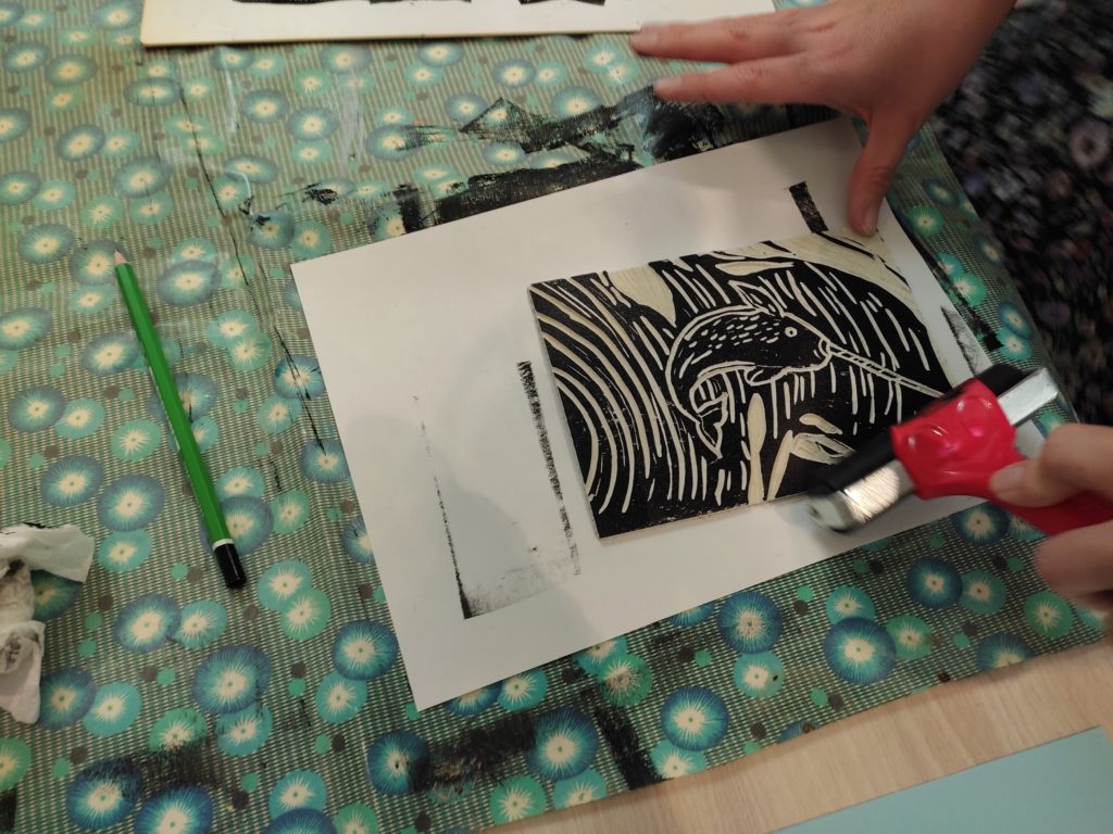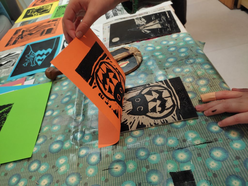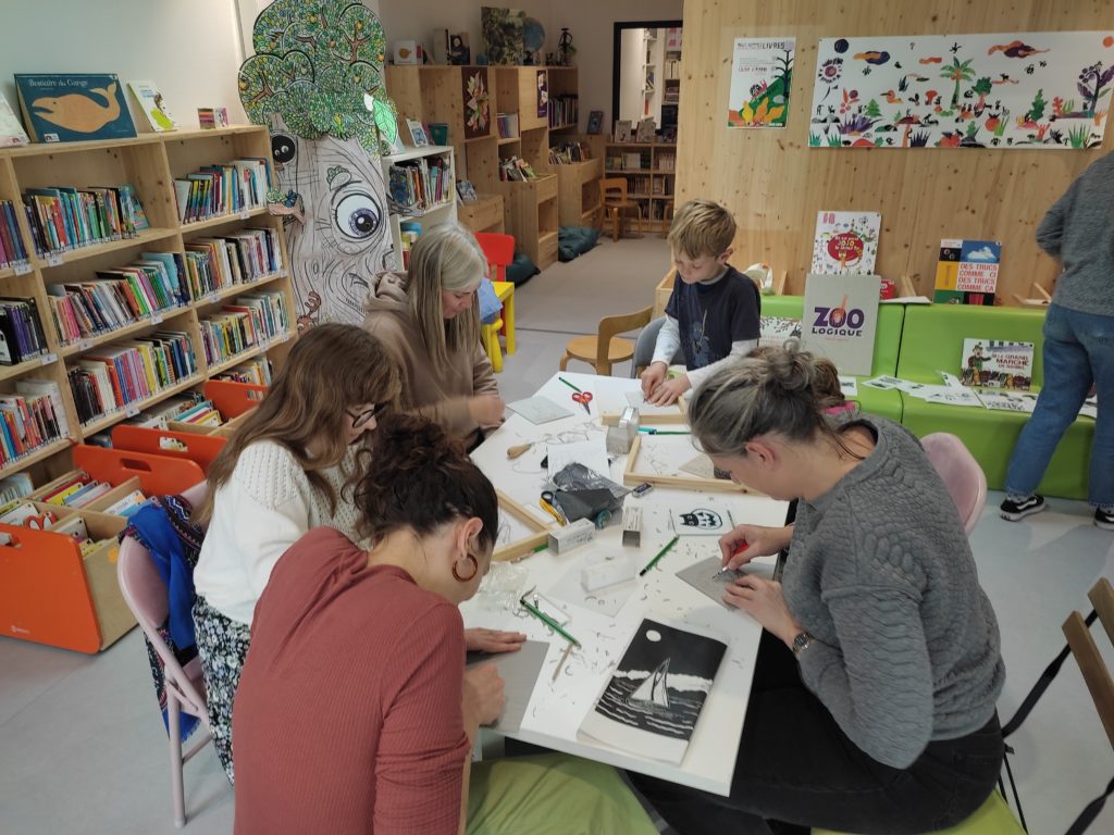 Dans le cadre des ateliers organisés pendant les vacances de Toussaint sur la thématique “Gravures et impressions”, la bibliothèque a proposé un atelier de linogravure, technique de taille d’épargne, qui consiste à retirer des parties du lino, qui forment des blancs. Les parties qui restent en relief sont donc recouvertes d’encre, et apparaissent lors du tirage.