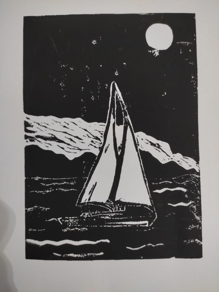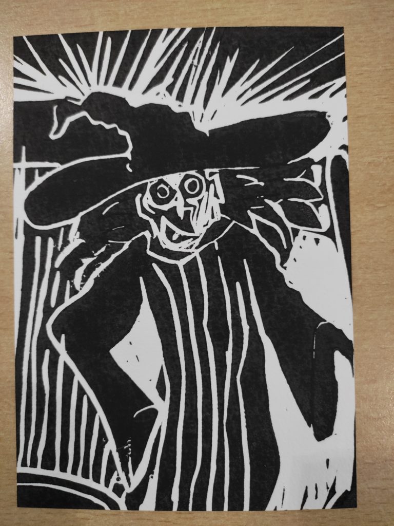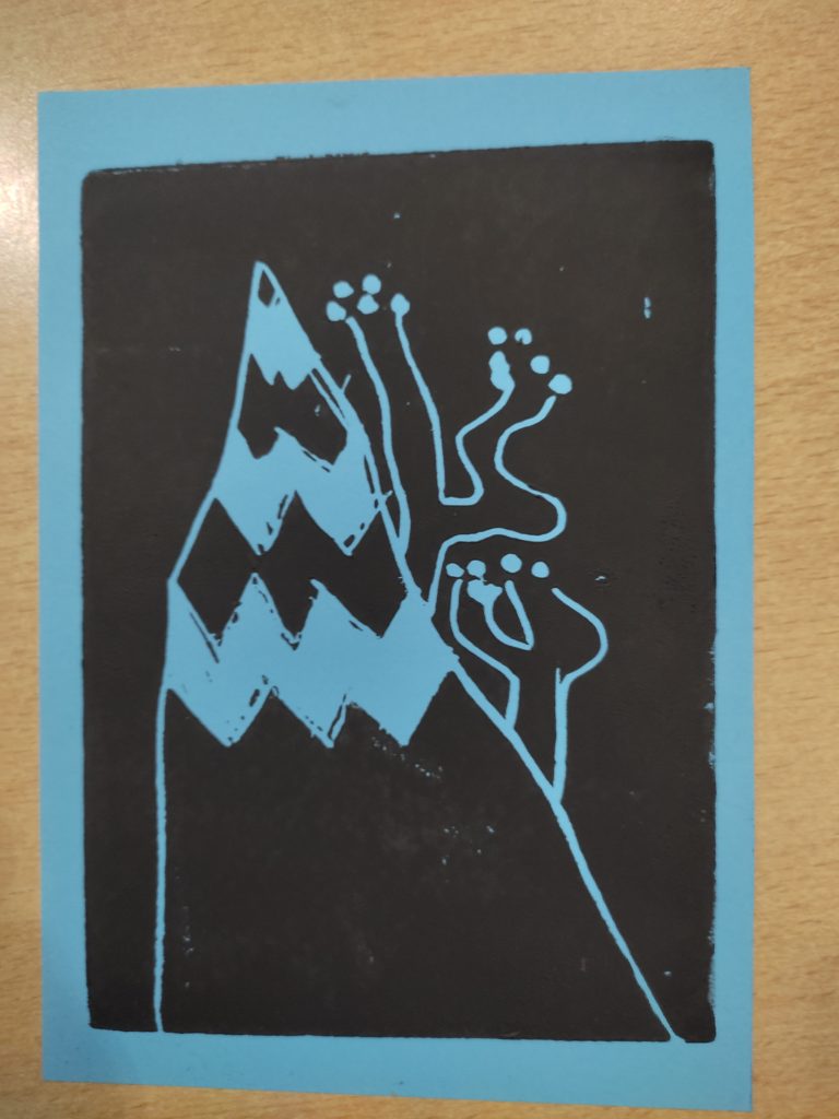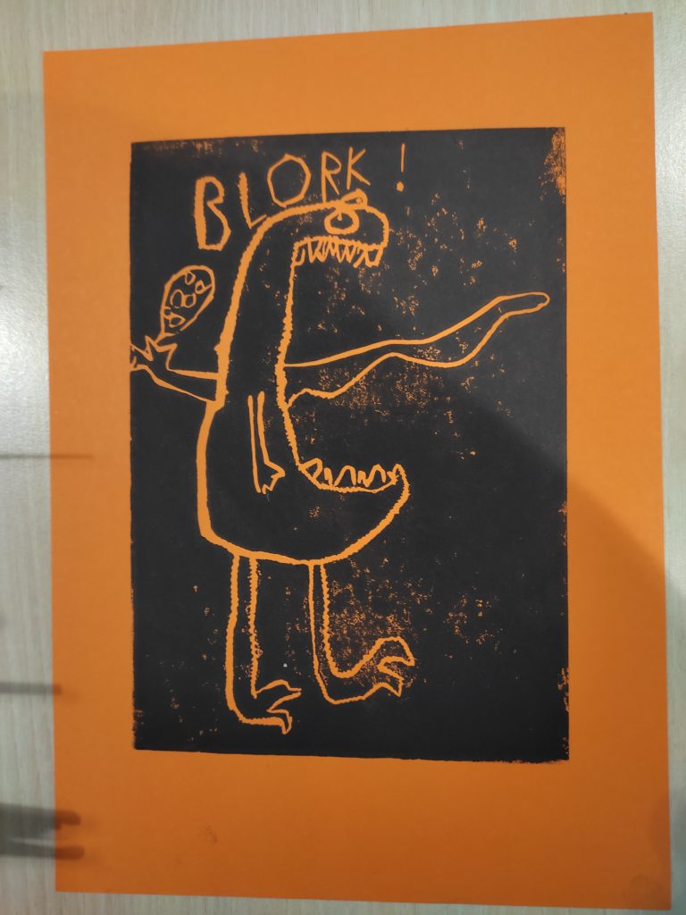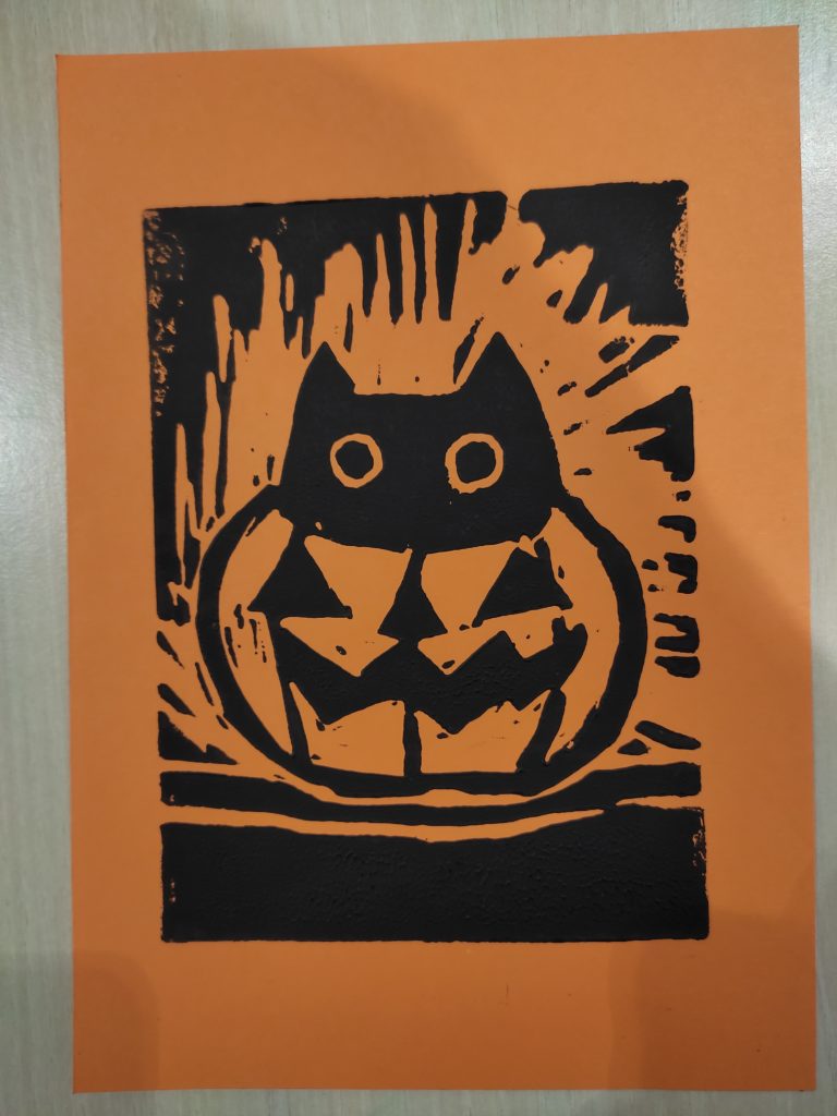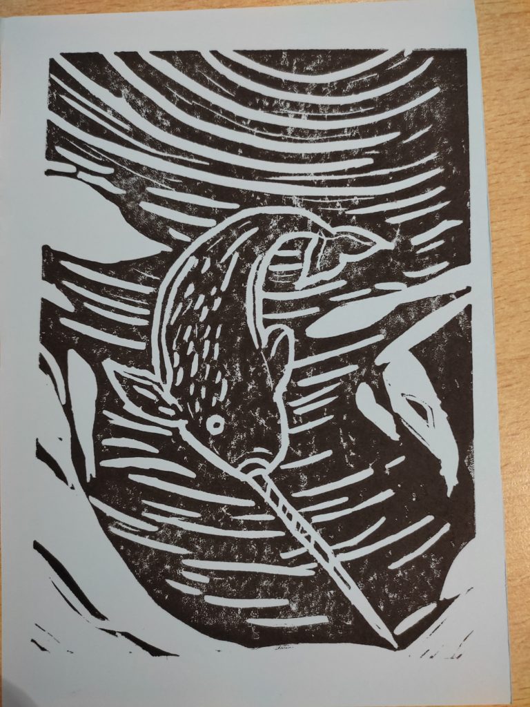 Dans le cadre des ateliers organisés pendant les vacances de Toussaint sur la thématique “Gravures et impressions”, la bibliothèque a proposé un atelier de linogravure, technique de taille d’épargne, qui consiste à retirer des parties du lino, qui forment des blancs. Les parties qui restent en relief sont donc recouvertes d’encre, et apparaissent lors du tirage.