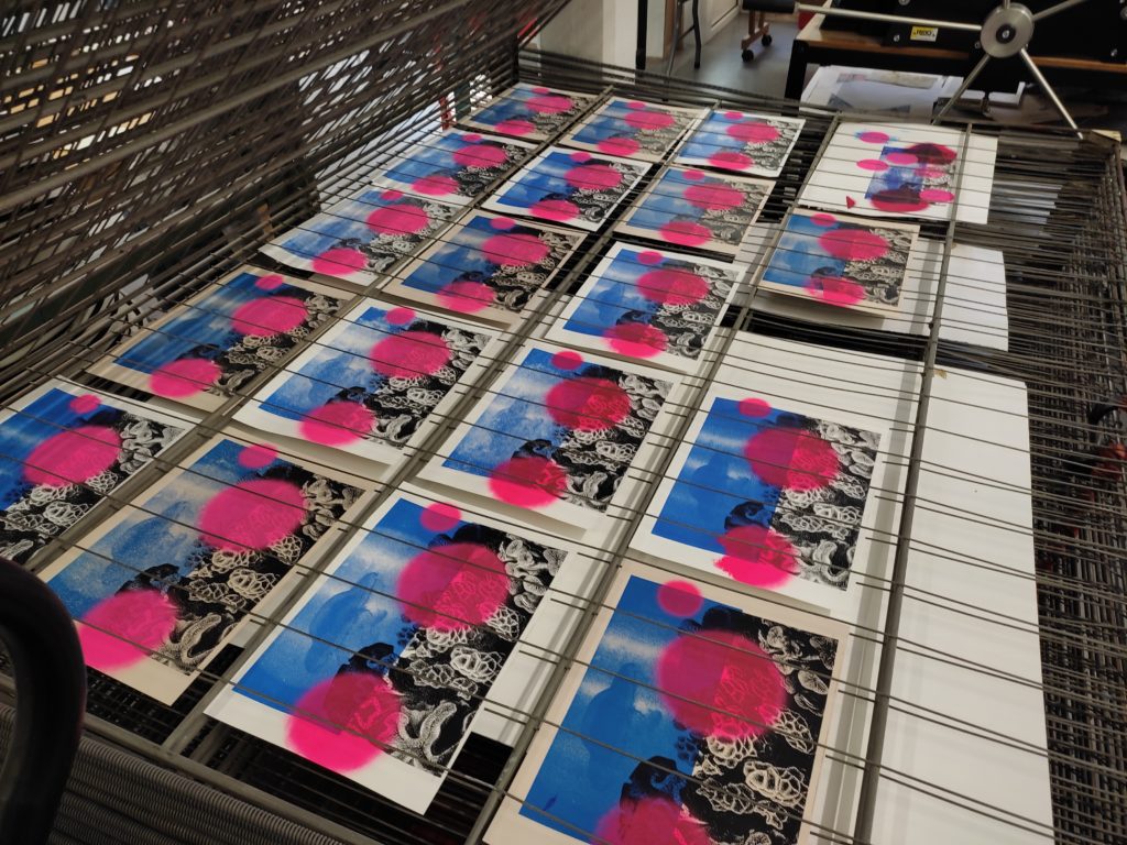 Les participants ont tour à tour fait l’impression des trois images, chacune dans une couleur spécifique (1ère impression en noir, deuxième tirage en bleu et enfin, dernier tirage en rose) superposées les unes sur les autres afin d’avoir un dessin en trois couleur.