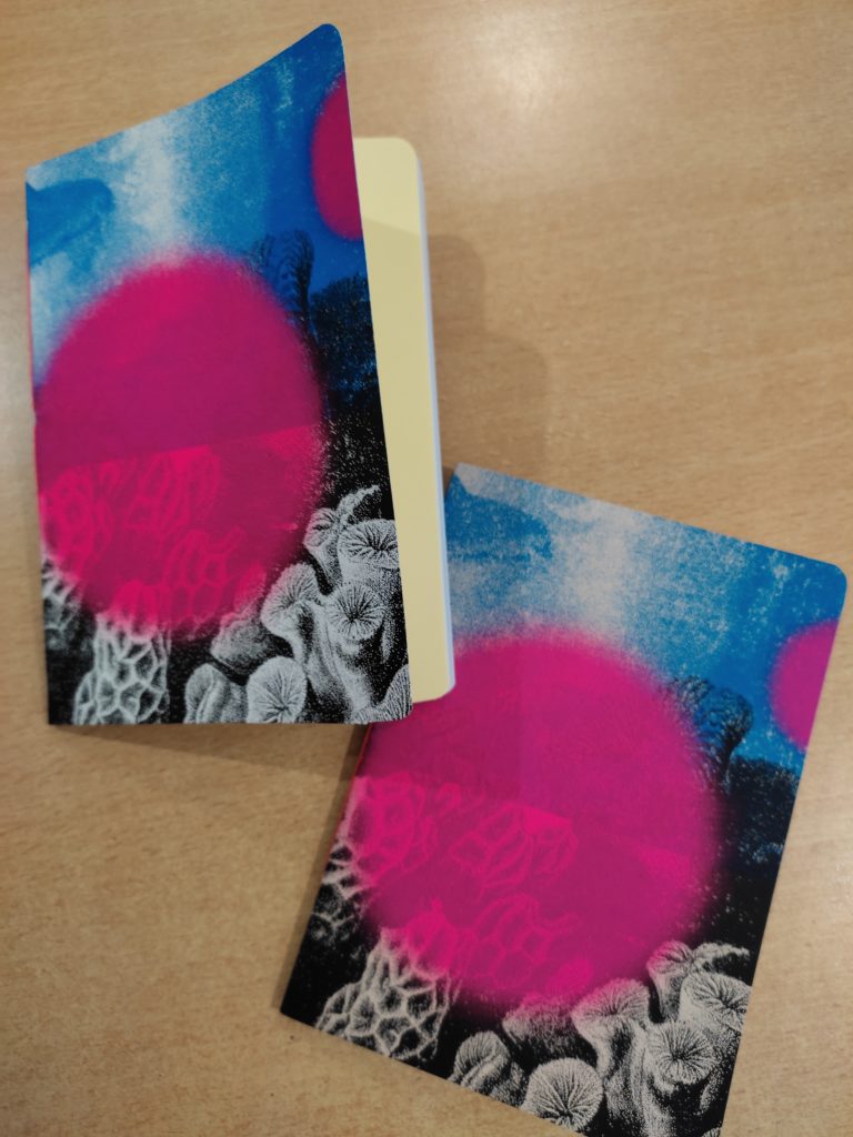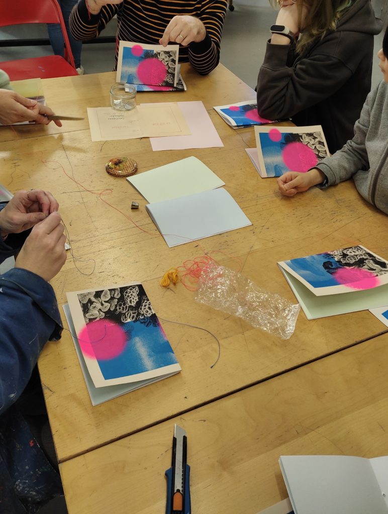 Une fois l’ensemble des tirages effectués, chacun a confectionné deux petits carnets, en regroupant les feuillets et la couverture sérigraphiée par une reliure cousue main.